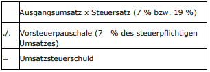 Wichtig: Nur die Vorsteuer wird pauschaliert. Die Ausgangsumsätze werden wie gewohnt besteuert. Keine Rolle spielt die Höhe der Betriebsausgaben und der tatsächlich ausgewiesenen Vorsteuer. Die normalen Vorschriften zum Vorsteuerabzug haben also keine Bedeutung.