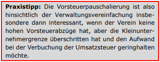 Die Vorsteuerpauschalierung kann im Einzelfall auch zu einem günstigeren steuerlichen Gesamtergebnis führen. Das gilt vor allem dann, wenn der Verein regelmäßig nur sehr geringe Vorsteuerbeträge zum Abzug bringen kann. Das ist bei gemeinnützigen Vereinen nicht untypisch, weil die Leistungen, die sie erbringen, meist Dienstleistungen sind, und der Personaleinsatz (keine Vorsteuer) dabei hoch, der Einsatz an Waren, Verbrauchsmaterial und Fremdleistungen aber gering ist. Der pauschale Vorsteuerabzug kann damit zu tatsächlich weit höheren Vorsteuer-beträgen führen, als dass es nach der tatsächlich enthaltenden Vorsteuer der Fall wäre.