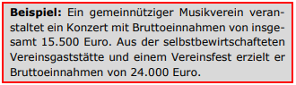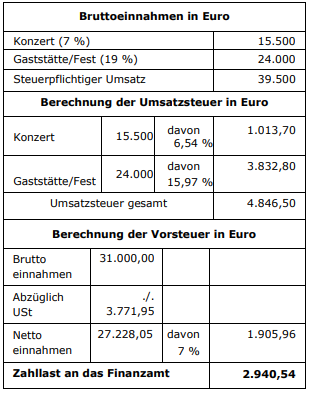 Die Einnahmen aus der selbst bewirtschafteten Vereinsgaststätte und aus dem Vereinsfest unterliegen dem Regelsteuersatz von 19 Prozent. Aufgrund der Vorsteuerpauschalierung beträgt die Umsatzsteuer-Zahllast im Ergebnis aber nur zwölf Prozent des Umsatzes aus dem steuerpflichtigen wirtschaftlichen Geschäftsbetrieb.