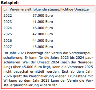 Durch die Anhebung des Höchstbetrags in § 23a UStG wächst der Kreis der Vereine, die die Vorsteuerpauschalierung nutzen können, und zwar mit dem Jahreswechsel. Die Neuregelegung ist nämlich zum 01.01.2023 in Kraft getreten und da sich die Betragsgrenze auf das Vorjahr bezieht, können Vereine, die im Jahr 2022 steuerpflichtige Umsätze von über 35.000 Euro, aber unter 45.000 Euro erzielen und deswegen die Vorsteuerpauschalierung nicht nutzen können, schon 2023 zur Pauschalierung wechseln.