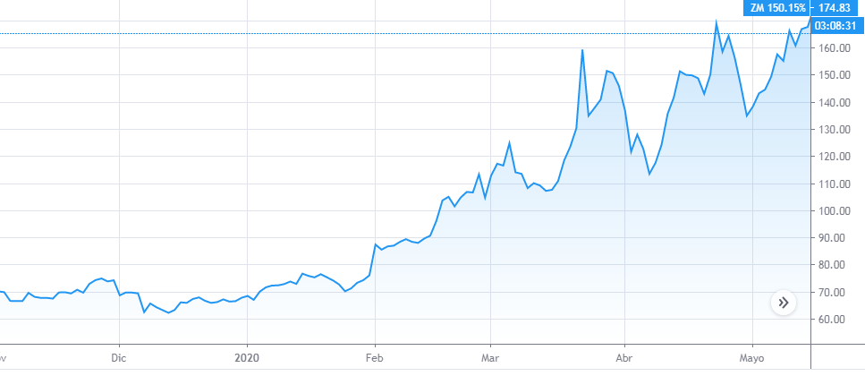 Evolución de la cotización de Zoom +150%, últimos 6 meses.