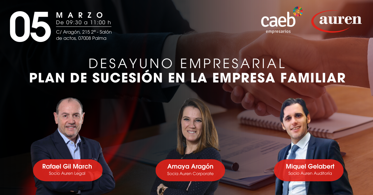Te invitamos a este Desayuno Empresarial donde abordaremos las alternativas existentes en un proceso de sucesión familiar, tanto dentro del seno familiar como a través de operaciones corporativas. Igualmente, trataremos el protocolo familiar, la importancia de la preparación y organización societaria, la fiscalidad aplicable a cada una de ellas y el papel que juega la transparencia financiera y la auditoría en todas ellas.