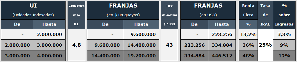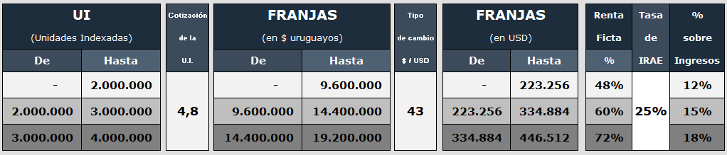 A las rentas incluidas en la primer categoría se les aplica la tasa del 25% sobre el 48% de los ingresos del ejercicio, es decir 12%, siempre que no superen las 4.000.000 de UI –USD 500.000 aproximadamente, ya que en estos casos se debe liquidar el impuesto por el régimen real a partir del ejercicio siguiente.