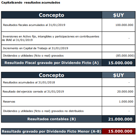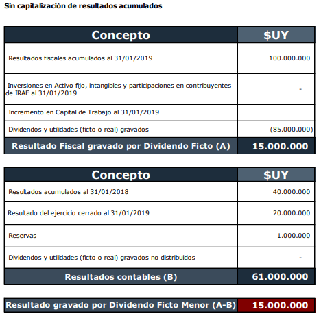 Con la entrada en vigencia de la Ley N°19.670, a partir del 1° de enero de 2019, no se deberá, a los efectos del cálculo de dividendos fictos, sumar a los resultados acumulados contables al cierre del ejercicio las capitalizaciones que se hayan realizado de resultados anteriores.
