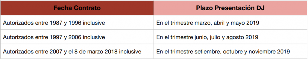 Aquellos Usuarios cuyos contratos hubieran sido autorizados a partir del 9 de marzo de 2018, deberán presentar por primera vez la Declaración Jurada, a los dos años contados a partir del inicio del ejercicio siguiente a la respectiva autorización.